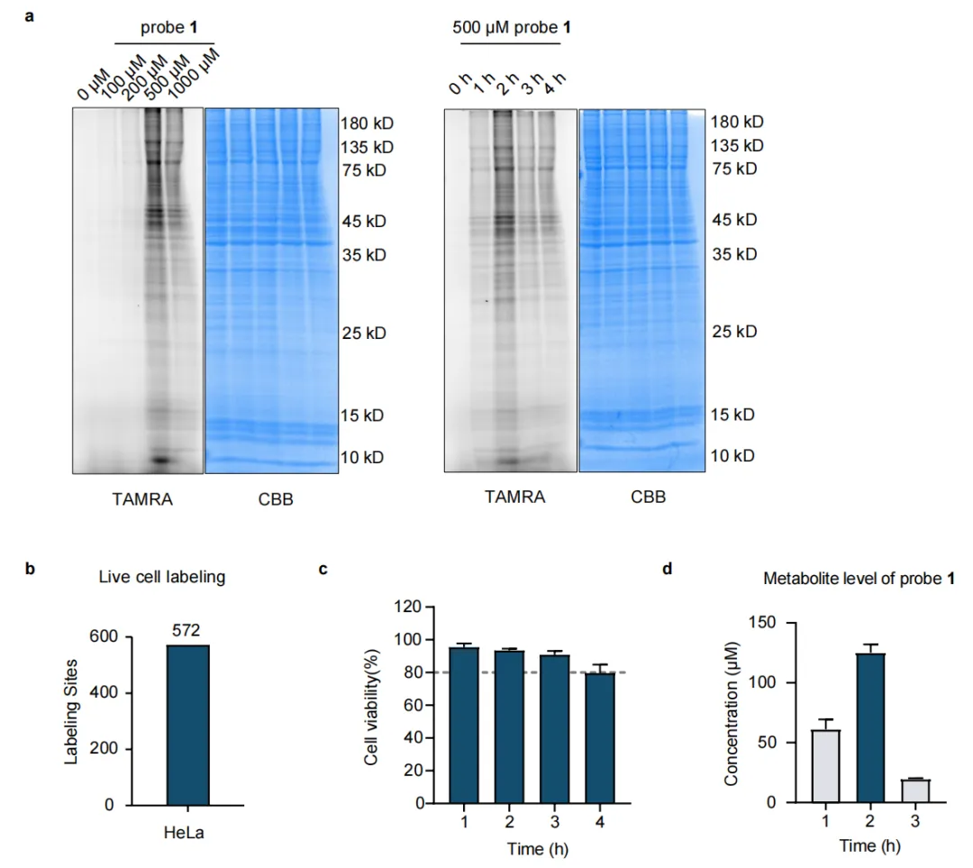 补充数据图3 | 探针1对活细胞精氨酸的标记。a) 探针1浓度与孵育时间对活细胞标记的优化。b) 通过探针1预期质量偏移的闭式搜索在活细胞中鉴定的精氨酸修饰位点数量。c) 通过CellTiter-Glo检测法测量的探针1在HeLa细胞中的细胞毒性。d) 通过靶向LC–MS/MS测定的探针1在HeLa细胞中的细胞内浓度。