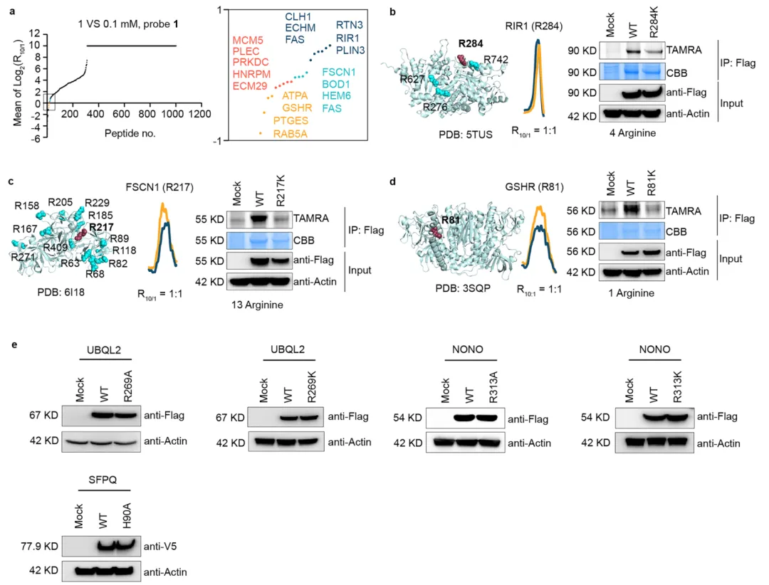 补充数据图4 | 人类蛋白质组中精氨酸反应性的定量分析。a) 两个生物学重复样本的log2(R10:1)值瀑布图,代表用于量化蛋白质组中精氨酸反应性的探针修饰精氨酸位点。b-d) 对含高反应性精氨酸残基(GSHR R81、RIR1 R284及FSCN1 R217)的蛋白质进行标记验证。重组野生型(WT)蛋白及其对应的精氨酸-苏氨酸(R-to-K)突变体在HEK293T细胞中表达,使用探针1标记并通过凝胶内荧光分析。e) 采用蛋白质印迹法验证 LLPS 检测的蛋白表达。
