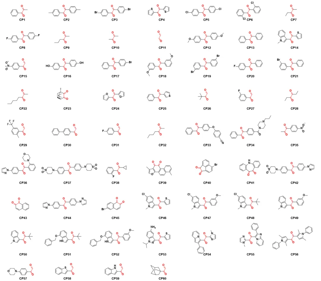 补充数据图6 | 本研究中使用的乙二醛化合物的化学结构。乙二醛化合物可分为三种结构类型:芳基二取代乙二醛(类型1)、烷基二取代乙二醛(类型2)和单取代乙二醛(类型3)。