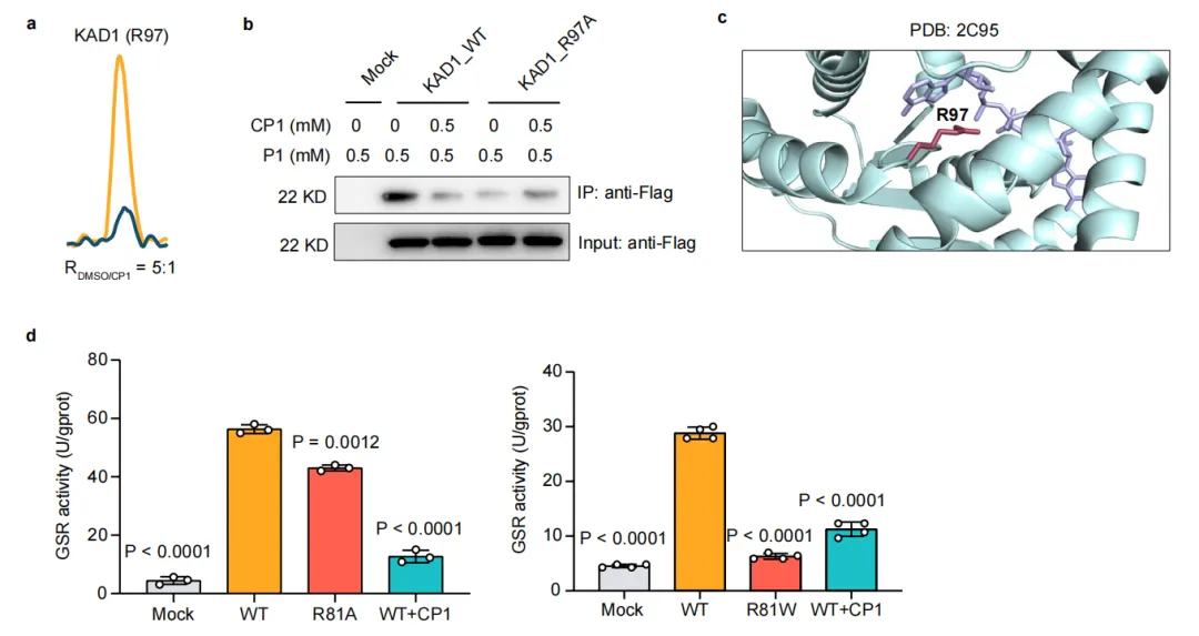 补充数据图7 | 细胞裂解液中配体结合精氨酸的验证。a) MS1提取离子色谱图(XIC)显示,当CP1与KAD1竞争时,探针1标记的肽段信号减弱。 XIC 下方标注了基于生物学重复计算的平均 RDMSO /CP值。b) 西部印迹验证显示,在表达野生型或精氨酸→丙氨酸突变体KAD1的HEK293T细胞裂解液中,CP1可选择性阻断探针1标记。c) KAD1结构模型(PDB: 2C95)突出显示配体结合的精氨酸残基。d) 条形图展示CP1、R81A和R81W突变对 GSHR 氧化还原依赖性酶活性的影响。