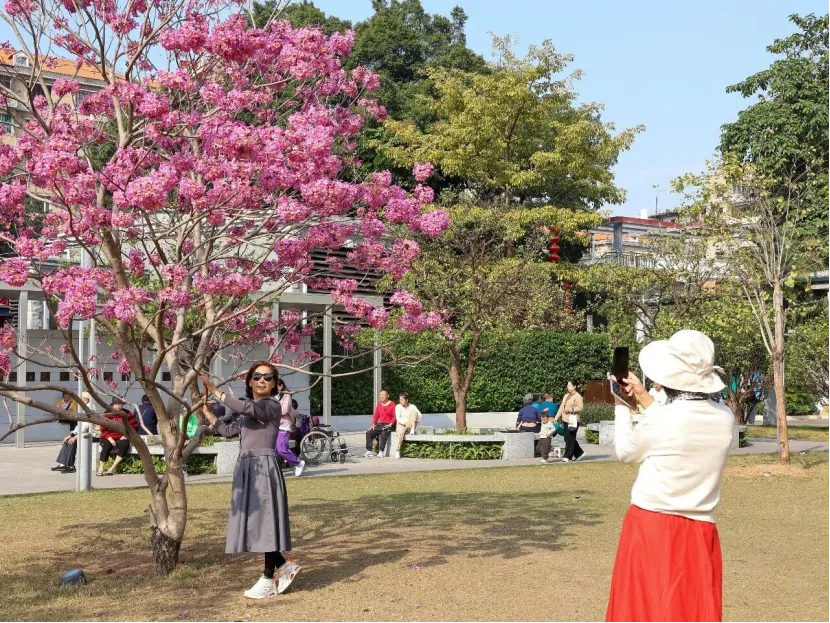寒风料峭的冬日,广州却藏着一抹温暖浪漫的粉紫色。近日,广州文化公园西南广场的紫花风铃木进入最佳观赏期,满树繁花竞相绽放,宛如一串串紫色风铃挂满枝头,微风拂过,落英缤纷,吸引了大批市民游客前来打卡赏景,成为羊城冬日里一道靓丽的风景线。
