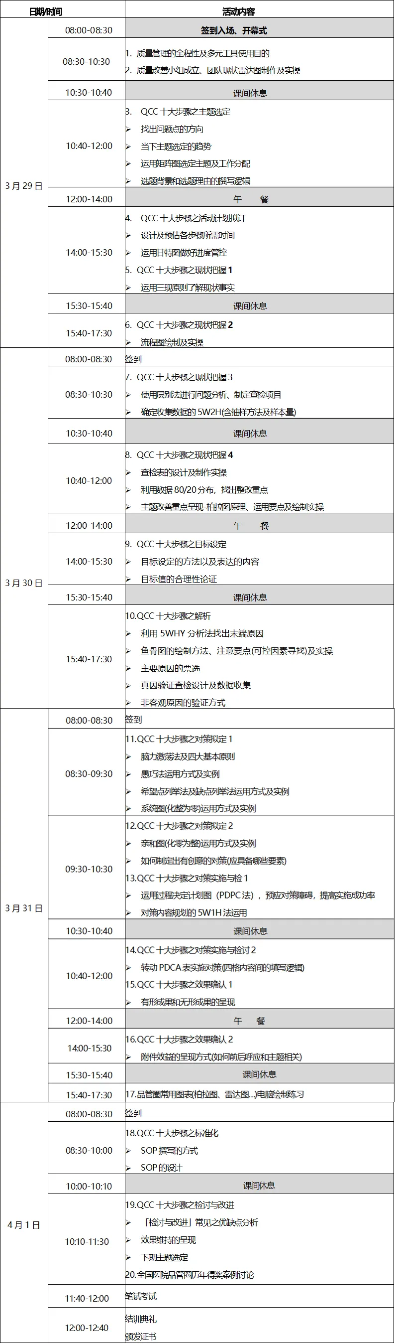 为进一步落实国家卫健委关于促进公立医院高质量发展等相关要求,全面促进各单位医疗质量及安全管理水平及管理工具应用能力,推动医院高质量发展,经研究决定于 2026 年 3月 29日--4月1日举办“第四十六期品管圈圈长实操沙盘训练营”, 本次活动采用工作坊授课模式,系统带领学员进行品管圈十大步骤的实际操作及品管圈工具运用,用激励、互动、实操等方式使学员在轻松地学习氛围下,掌握问题解决型品管圈的正确执行步骤、各类数据分析方法、设计和绘制图表等内容,让学员全程感受最正确的做法,最专业的解答,最轻松的学习!