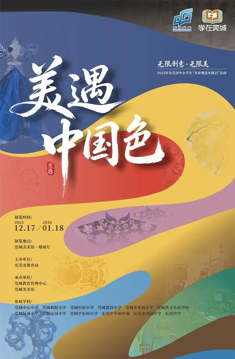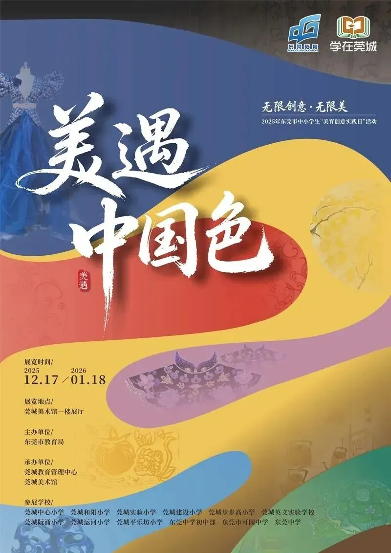 📒介绍:本次展览以《美遇·中国色》项目式课程群为核心内容,在东莞“人人美育”理念与“无限创意无限美”年度主题的双重引领下,汇聚莞城九所学校的美育实践成果。每一所学校都成为色彩的探索者,从中国传统色谱中撷取独具韵味的一页,以项目式学习为路径,让古老色彩在当代课堂中焕发新生。