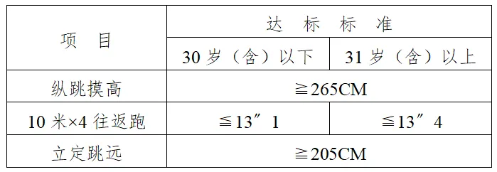 体能测评包括三个项目,分别为纵跳摸高、10米×4往返跑、立定跳远(男子)/仰卧起坐(女子),每个项目测试次数不超过2次。体能测评采用达标制,任意一项不达标的,即为体能测评不合格,不进入下一环节。体能测评不设缓测、补测,达标标准详见下表。