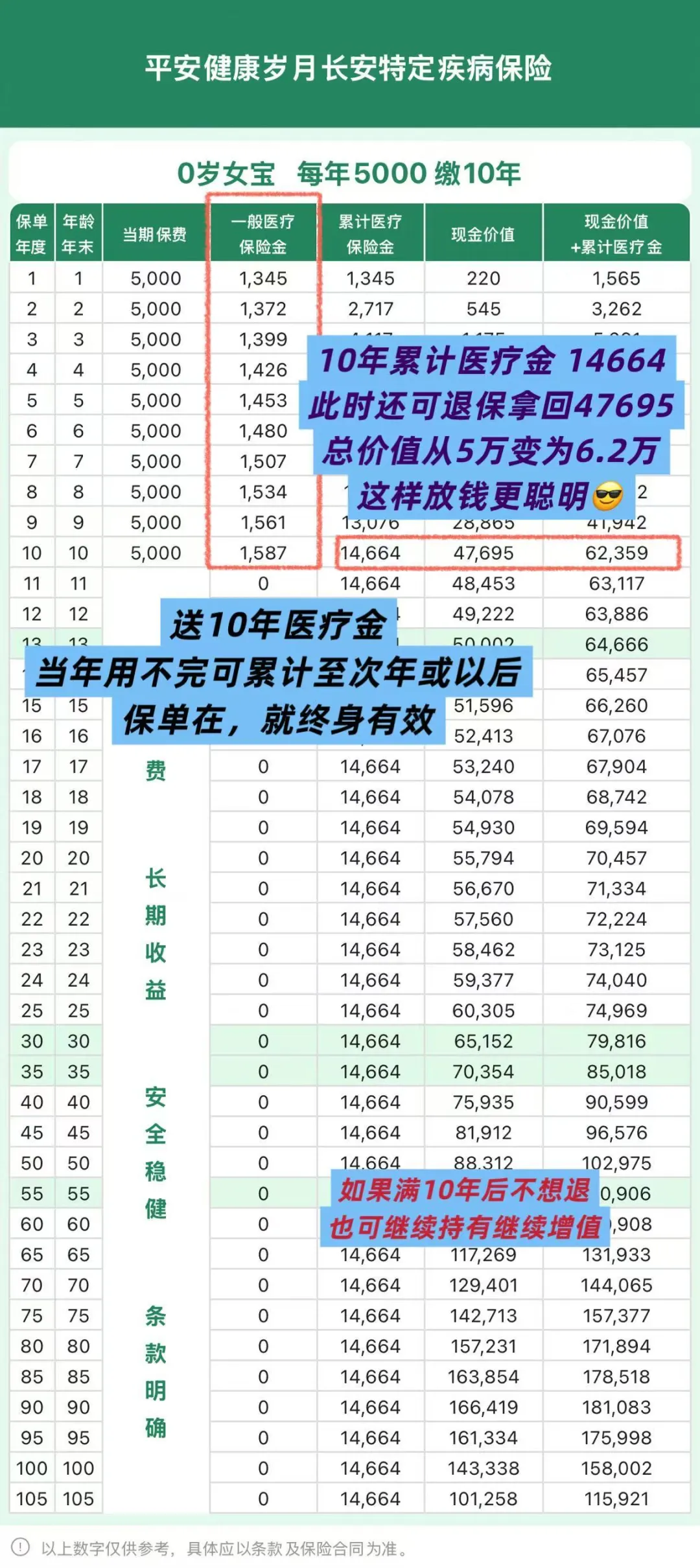 像这样,不满周岁的女宝宝,每年交5千,连续交10年,第一年可以有1345元医疗金,第二年是1372元……10年下来总的医疗金是14664。