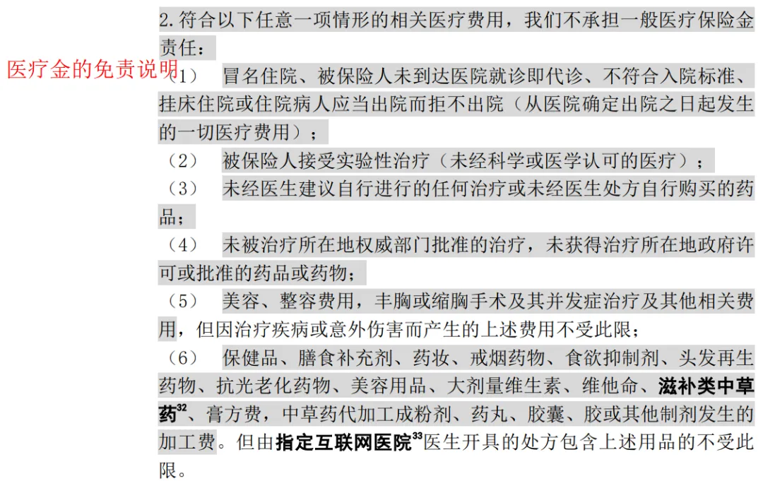 免责条款也是有的,但我们常规的为治疗产生的合理必须费用都是可以的。