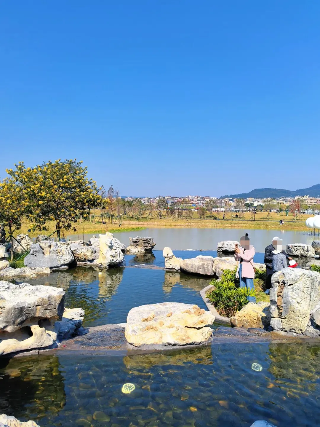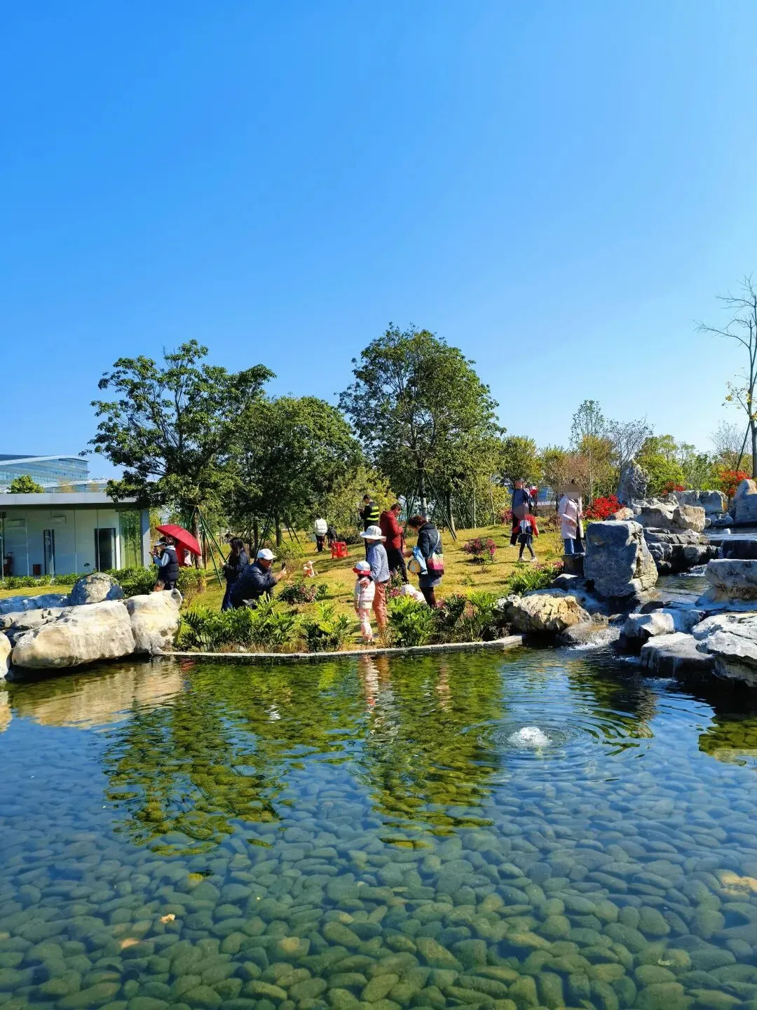 水塘旁边还有一段叠石垒起来的流水,水中好多小石头,清晰可见。小朋友们穿梭来穿梭去,好欢乐呀。
