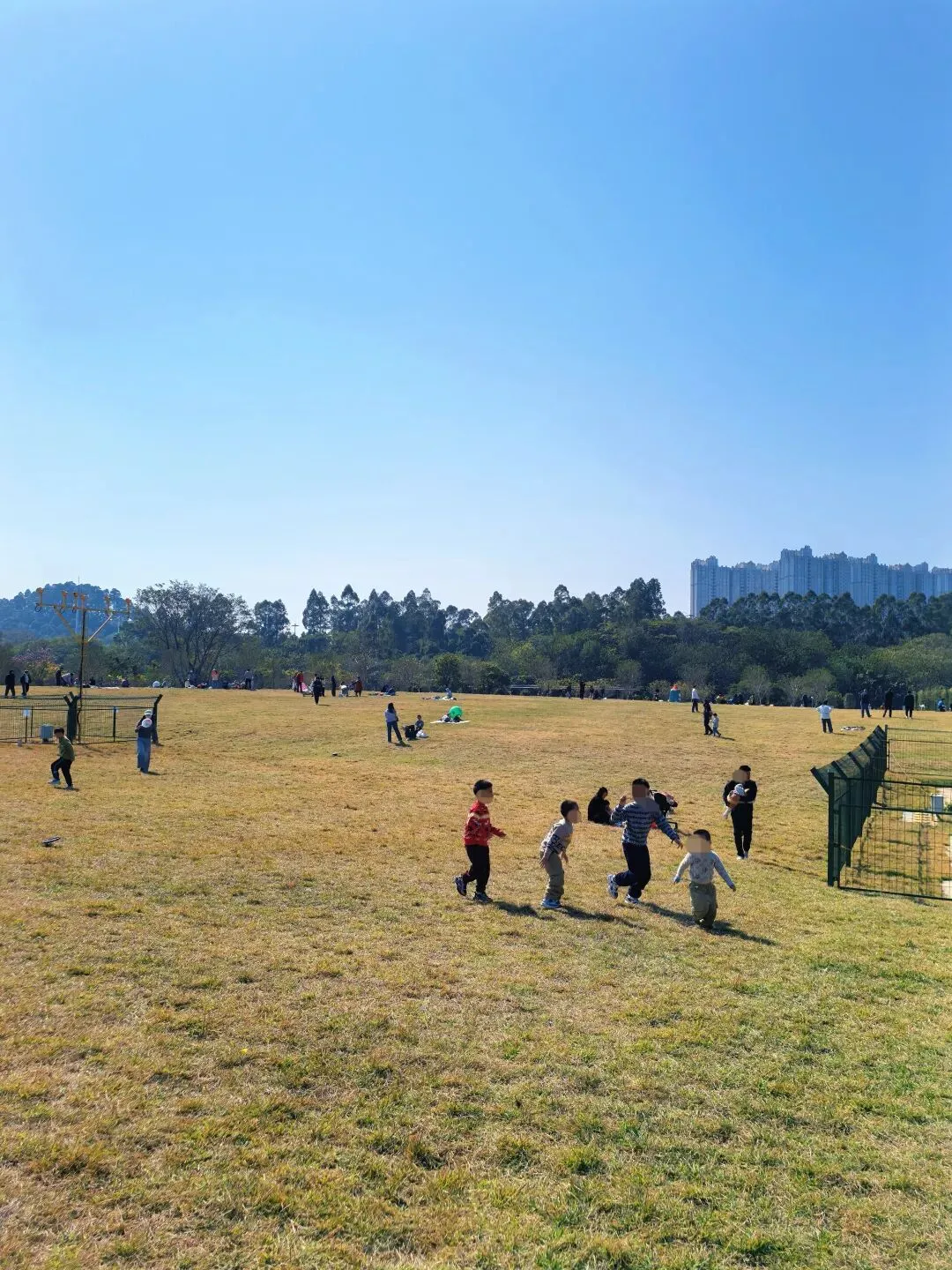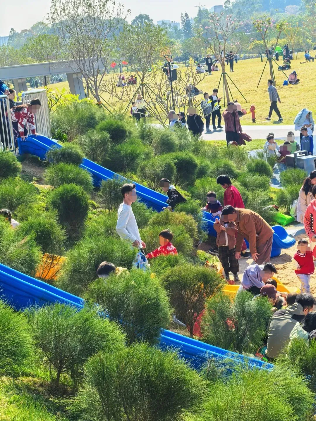 草坪不是非常平坦,随着地势有些小坡度,这样更好让小朋友玩耍。奔跑、吹泡泡、玩气球,到处都是小朋友肆意奔跑玩耍的身影。