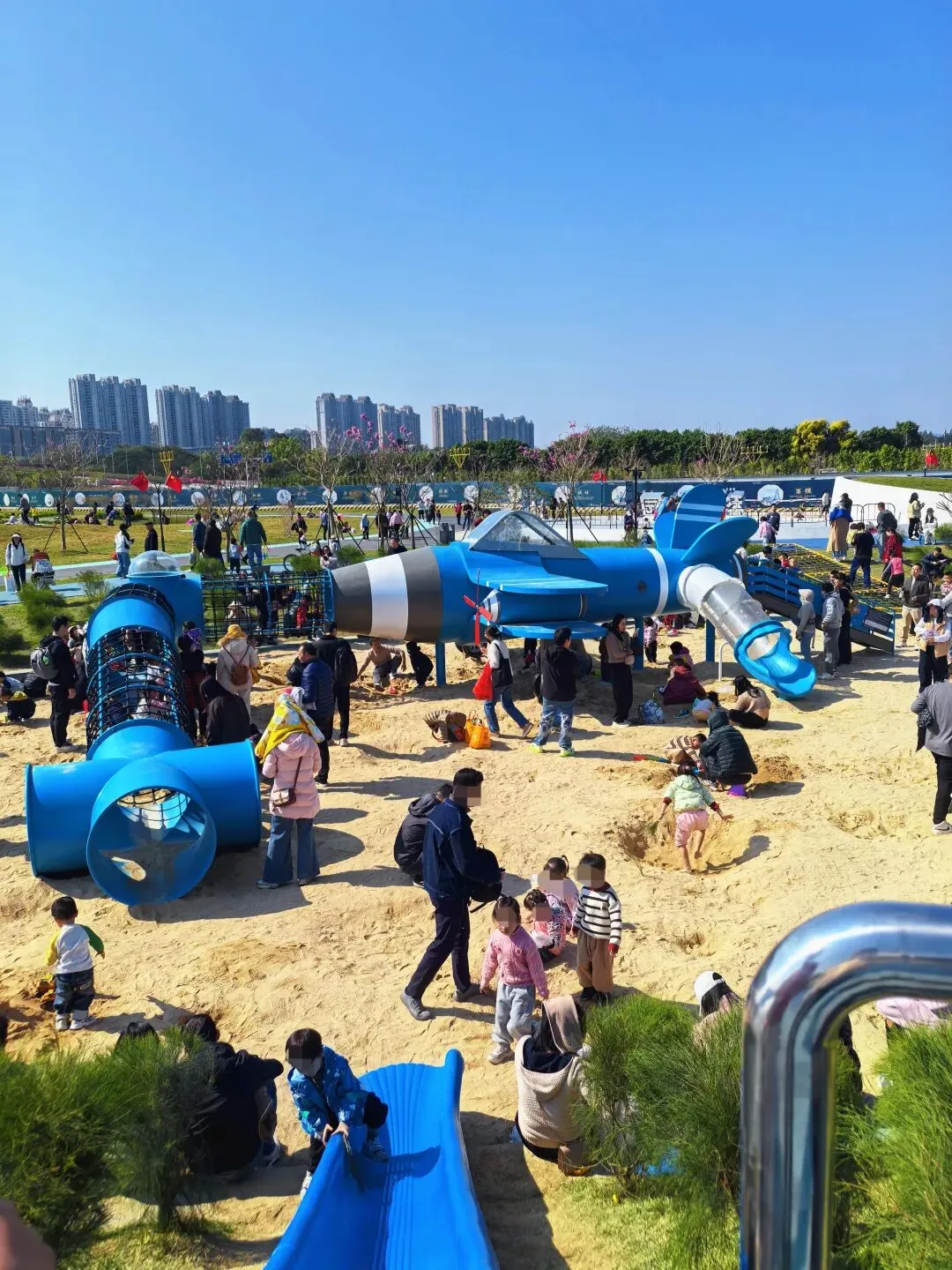密密麻麻都是小朋友的身影,有的穿梭在飞机机舱里面,攀这爬那。有的在滑滑梯,嗖嗖的,一个个小身影像个小火煎一样俯冲下去,连风都变得格外柔软。