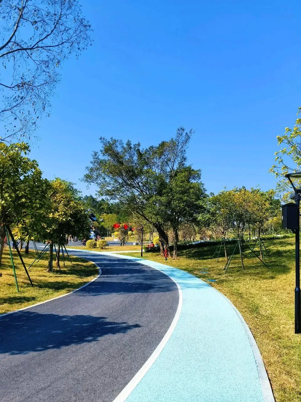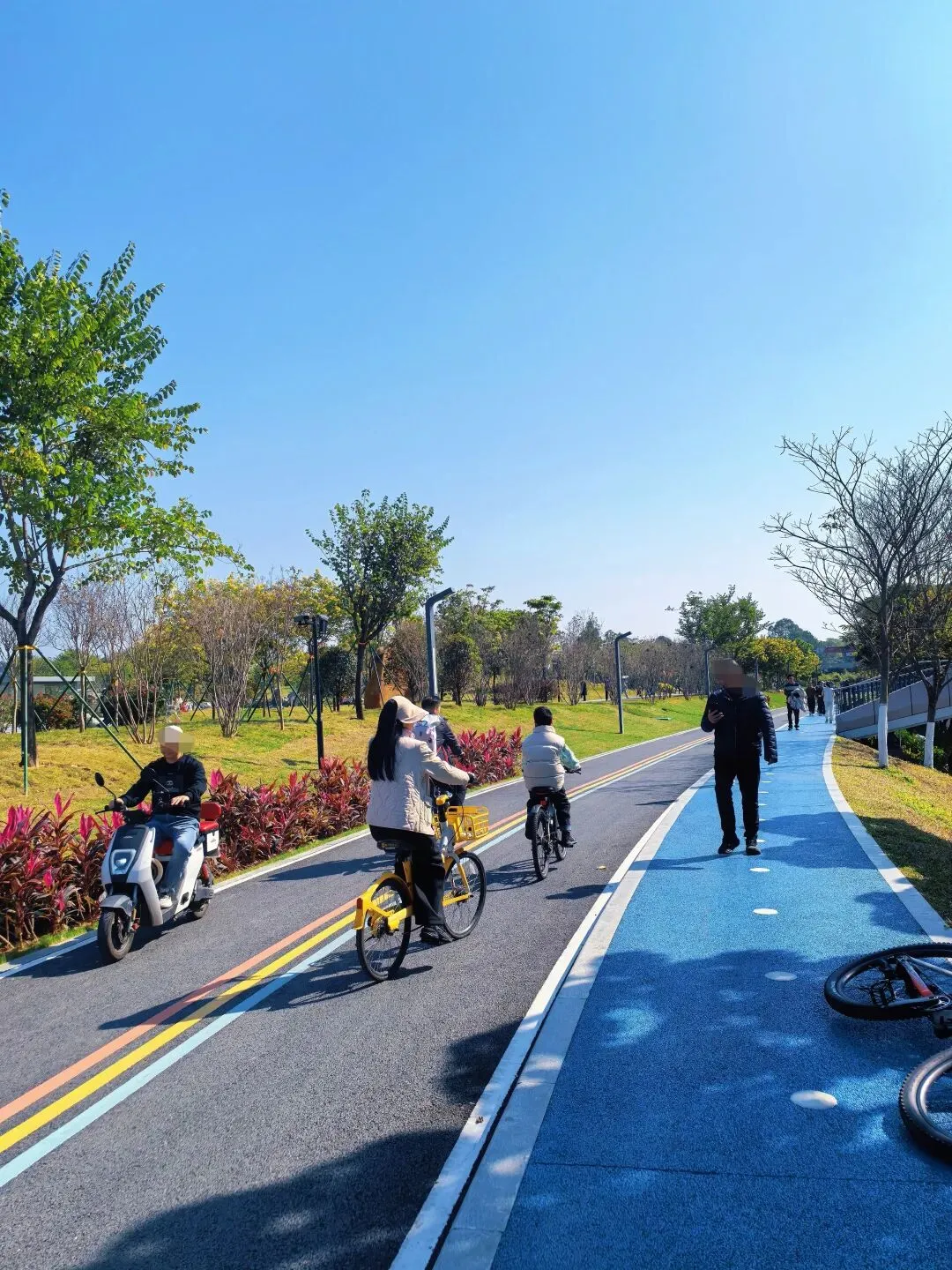 河涌边上还有碧道,这条碧道跟公园的浅绿色不一样,天蓝色的徒步道,还有划有彩虹颜色的骑行道,骑行徒步都很悠闲。