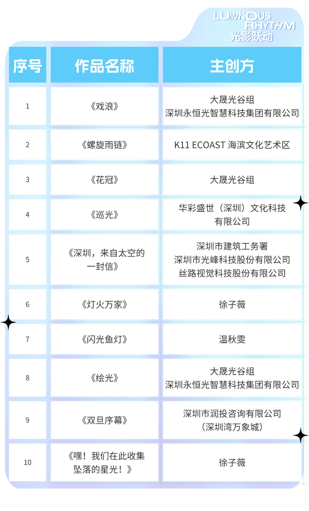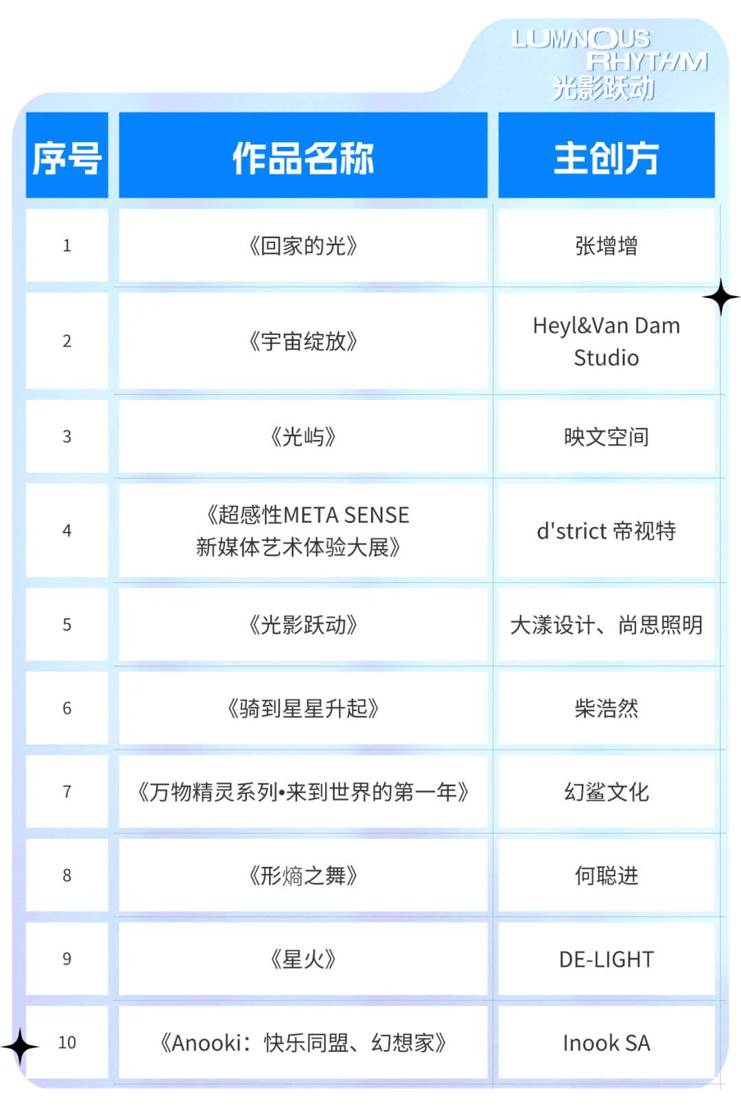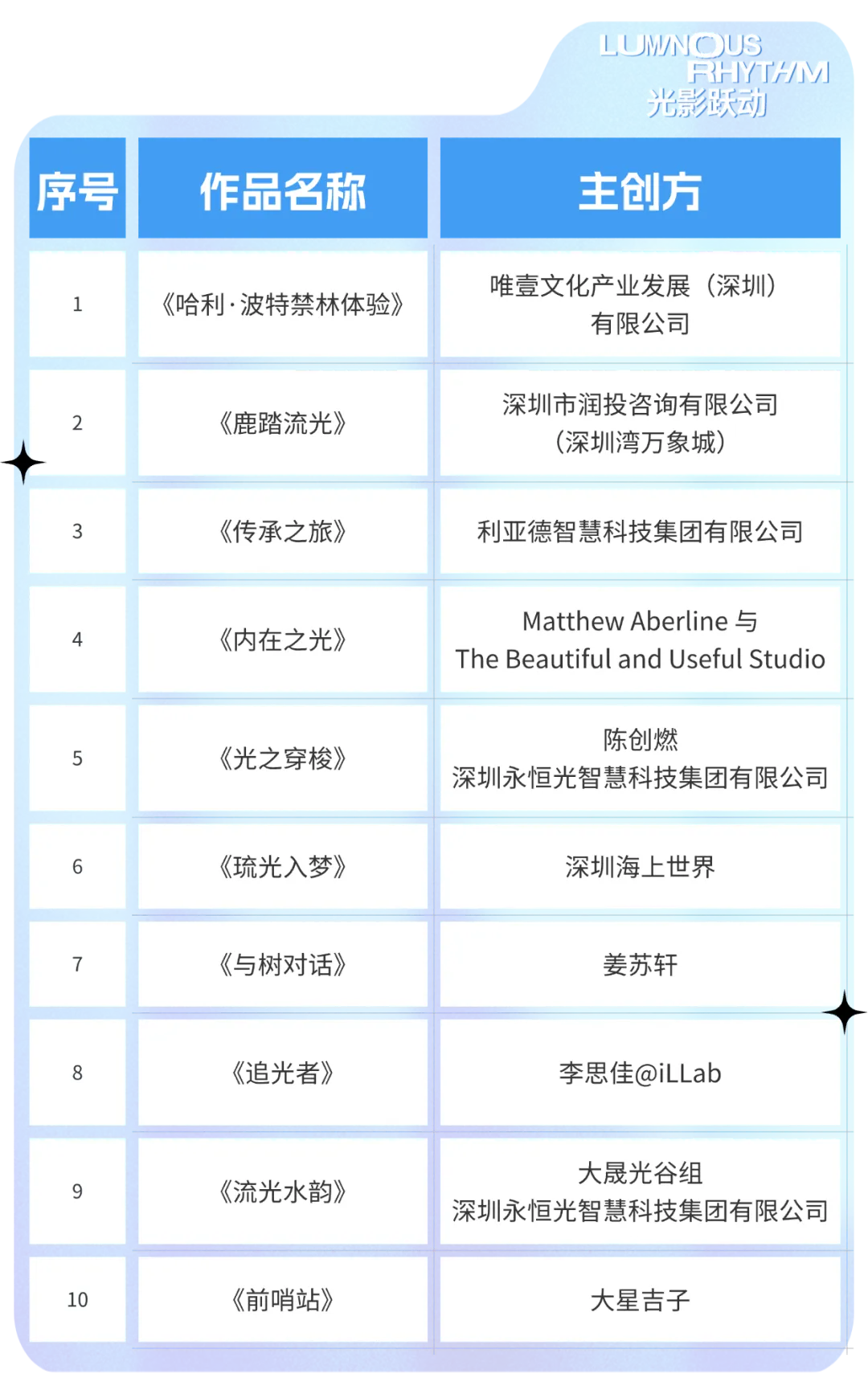最终,经艺术、照明、建筑、设计、媒体等领域共30位代表共同打分评选,并经公示完毕,本届光影艺术季评出金奖10名,星光奖10名,启光奖10名。