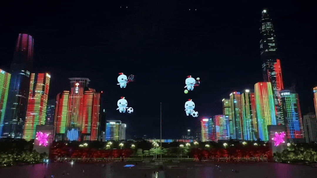 作品巧妙融合深圳光影艺术季的绚丽色彩与十五运会、残特奥会的蓬勃活力,以光影为画笔勾勒运动姿态,以运动为音符奏响城市旋律,让动态光影与体育精神碰撞交融。作品不仅为城市夜晚增添了热烈鲜活的活力,更生动诠释了深圳年轻向上、拼搏进取的城市气质。