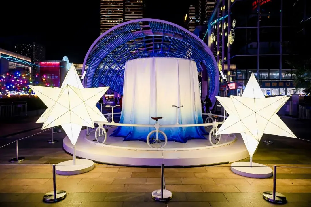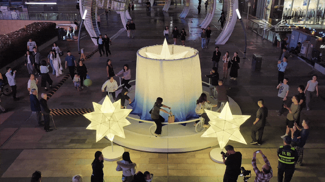 作品灵感源自每个人童年记忆中的转转车,在都市场景中焕发新生。 当游客踏上踏板,星辰光影便随之起落流转,让童梦瞬间在现实中复活,大人小孩争相体验,亲手点亮属于自己的浪漫星光。