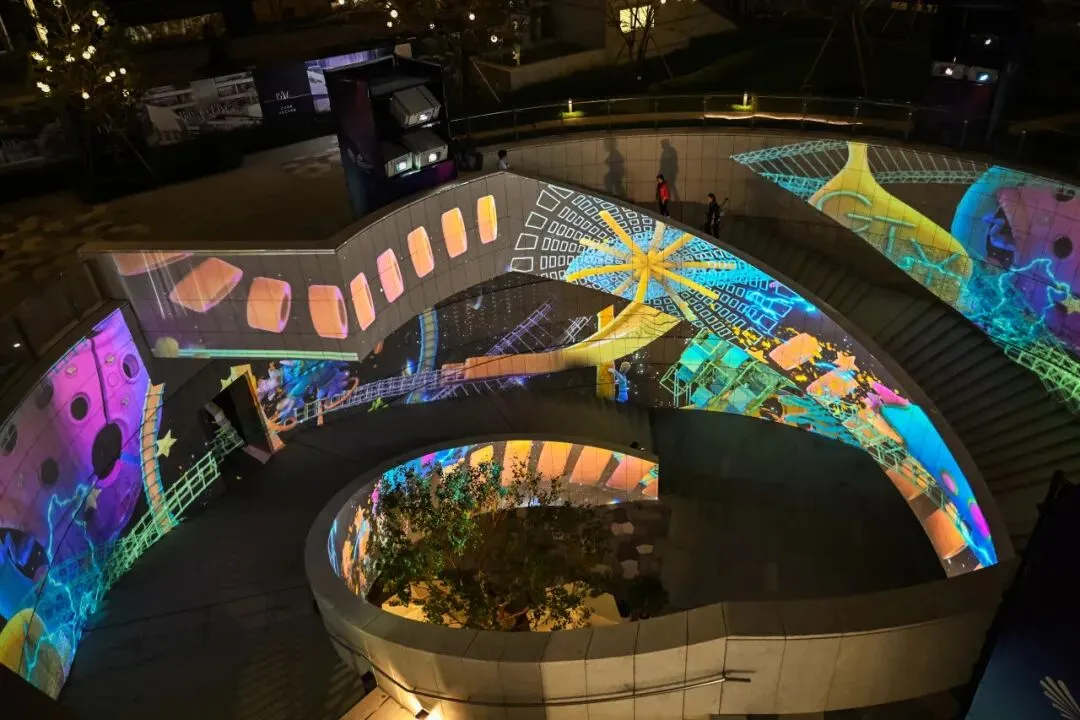 作品将人行天桥拱顶化作“会呼吸的天空”,通过多层投影覆盖,打造出海底世界、浪漫花田等多元场景,场景切换自然流畅,仿佛置身梦幻秘境。更巧妙融入十五运会吉祥物“喜洋洋”“乐融融”的蹦跳身影,让光影景观更具趣味性与地域辨识度,为市民的出行之路增添惊喜与欢乐。