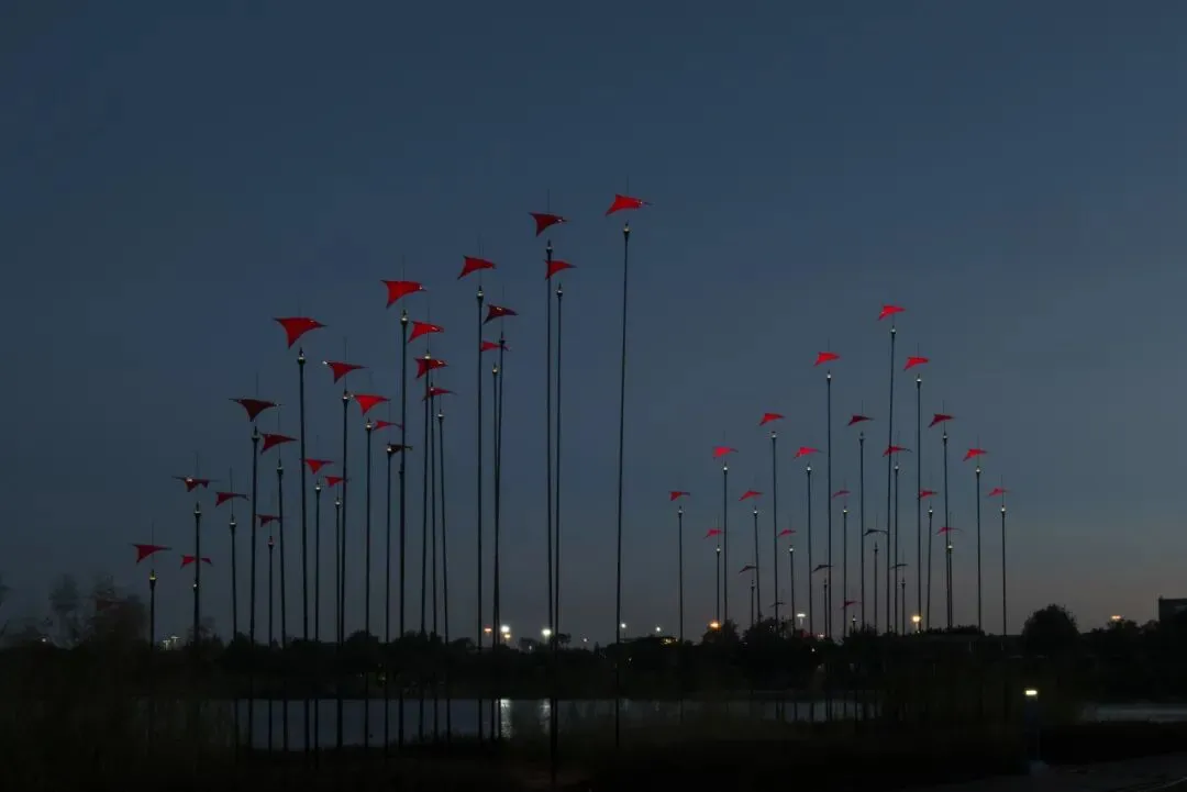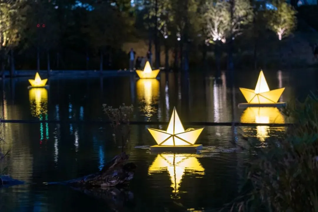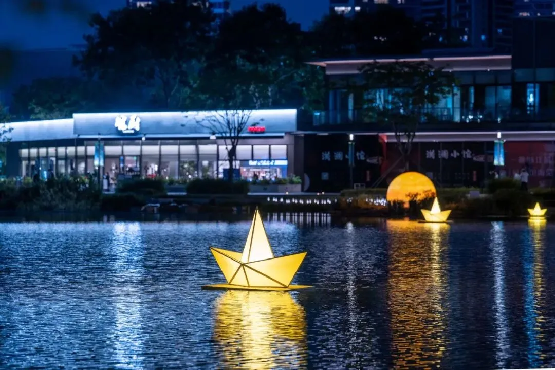 一组组灯光船轻盈浮于湖面,随风轻轻微动,光随波逐流,影因风而起,宛如星子跌落水面,在夜色中轻轻闪烁,静谧而美好。《巡光》不语,却与自然同频,成为夜晚最诗意的流动风景。