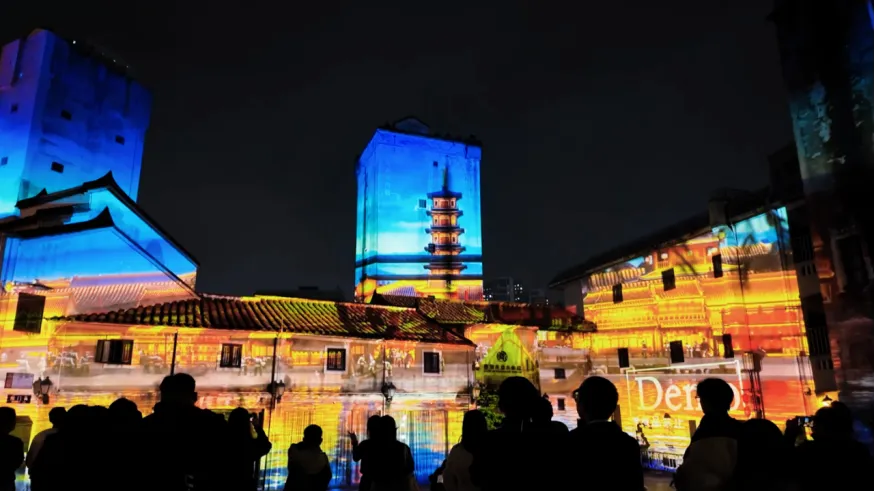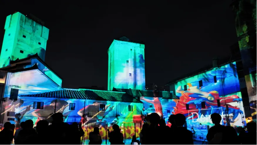 作品以观澜客家排屋与百年碉楼为天然的巨幅画卷,运用顶尖的光影投影技术,将古墟的百年风云、人文故事娓娓道来,让观众直观感受古墟从过去到现在的变迁,在光影流转中读懂本土历史文化的厚重与韵味,实现传统与现代的对话。