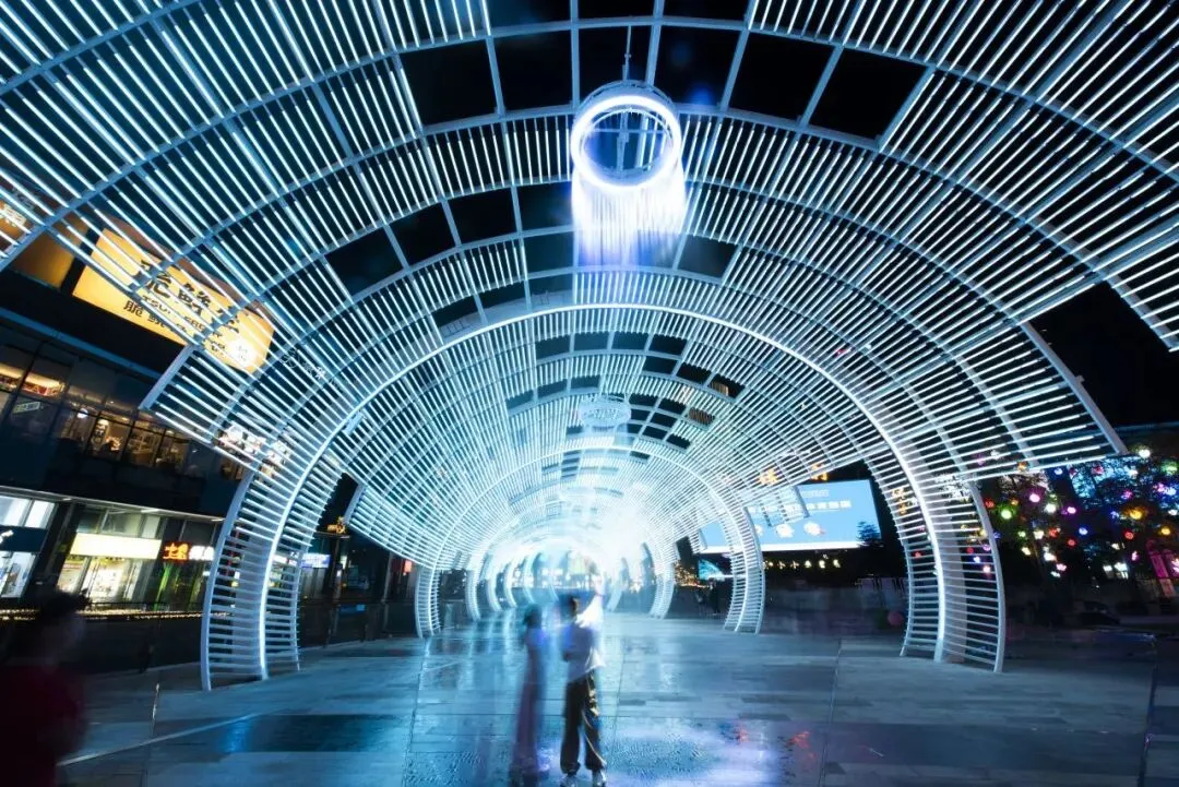 作品以极具科技感与艺术感的造型融入城市夜色,与观者对话、交互,在光影流转间唤起人们对宇宙星空的无尽遐想,为喧嚣商圈注入一抹浪漫的科幻气息。