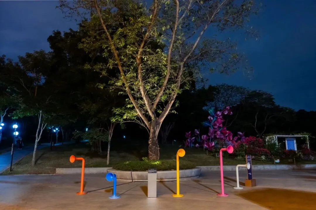 作品设置传声筒互动装置,邀请人们凑近与树木“交流”,通过语音识别与生成算法,让树木以光的呼吸节奏与诗意的声音回响作答。这种互动形式打破了人与自然的沟通壁垒,让人们在城市公园中重新建立与自然的情感连接,感受万物有灵的美好。