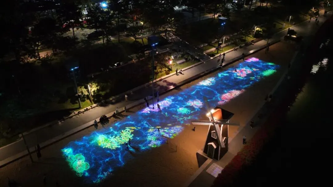 作品以沙滩为天然画布,通过互动投影技术构筑出光影与浪潮交融的艺术乐园,将“山海连城”的深圳城市特色具象化。孩子们奔跑的步伐能激起层层光浪,笑声与光影同步跳动,科技与自然在“山海连城”的深圳共振出温暖的人文之光。