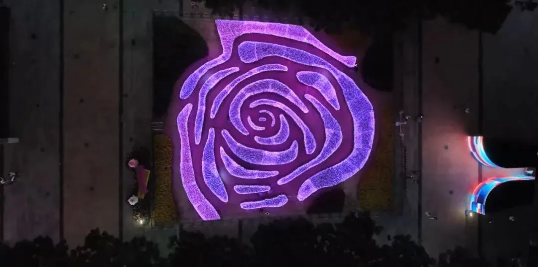以“星火”为核心意象,近看,每一颗“星火”都跳动着独特的红色光芒,带着专属的纹理与温度;远观,星火在风与人流的节奏中相互呼应、联动闪烁,营造出庄重而温暖的氛围,传递出民族同心的深厚情感。