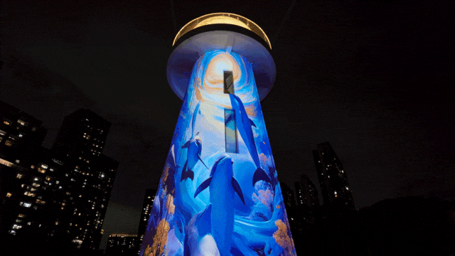 艺术家于灯塔外壁投射出磅礴大气的动态影像,以光为笔,以塔为卷,生动勾勒出勇往直前的航海者群像与深圳改革开放的壮阔发展图景。原本作为导航标志的灯塔,在此化为一座凝聚信念、指引未来的精神图腾,既致敬航海精神,也彰显深圳敢闯敢试、勇立潮头的城市品格。
