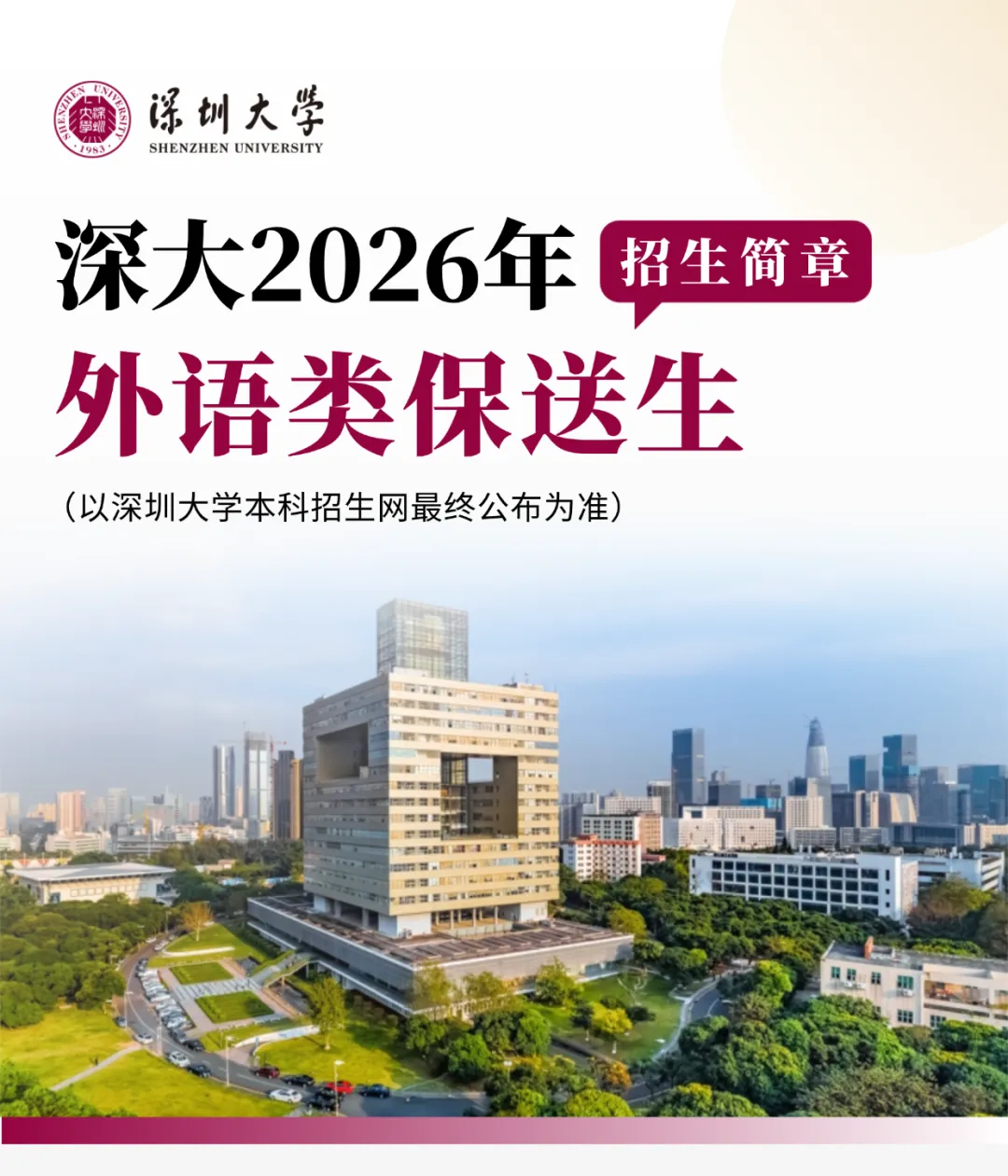 测试地点:深圳大学粤海校区,面试具体安排详见深圳大学本科招生网于2026年3月2日左右发布的外语保送生选拔测试须知。