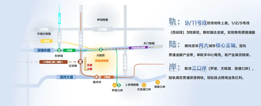 位于罗湖区桂园街道的云启大厦,堪称此次新线开通的 “最大赢家” 之一。作为地铁 9 号线、11 号线二期红岭南段的上盖物业,大厦地下一层直接与红岭南站连通,实现 “出地铁即达办公室” 的便捷体验。