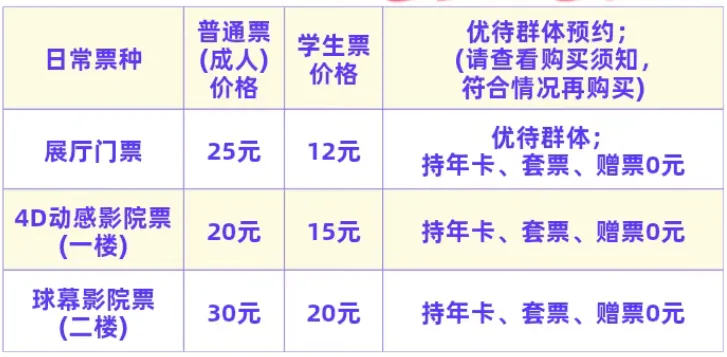 4、免费开放日参观范围仅限于常设科普展厅(负一层至三层,温馨提示:二楼信息与高新技术展厅信息科技基础展区于2025年11月18日起进行改造施工。为确保安全,施工期间对该区域进行封闭,暂停开放),4D动感影院和IMAX球幕影院按规定收费,具体票价👇