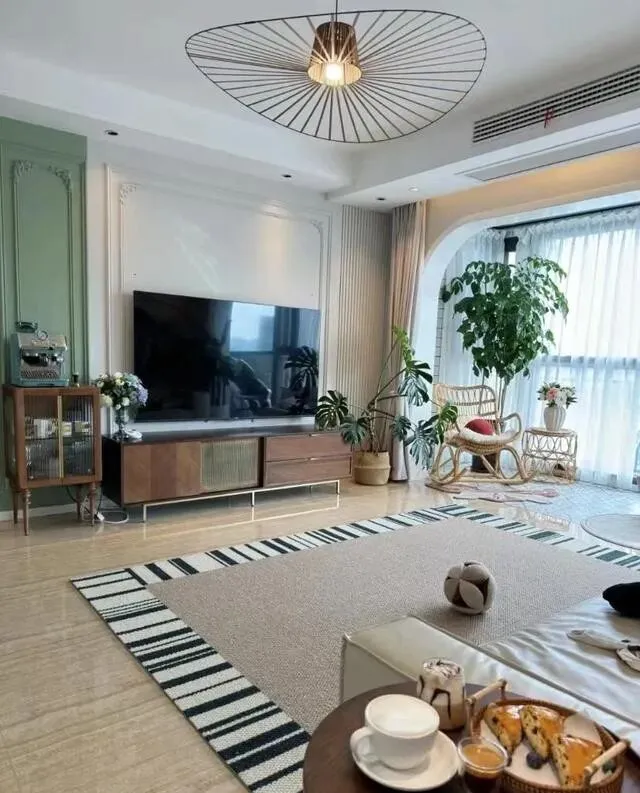 先说吊顶 , 双眼皮设计 , 层次感拉满 , 中间挂了个草帽造型的灯 , 你没听错 , 草帽!