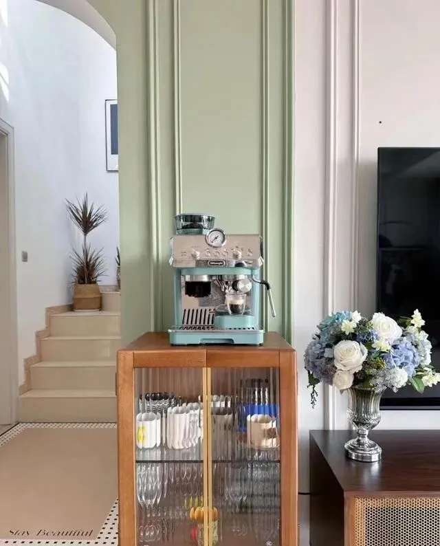 一个小小的实木斗柜 , 配长虹玻璃柜门 , 通透又有质感 , 顶上放了咖啡机 , 直接变身小水吧台。