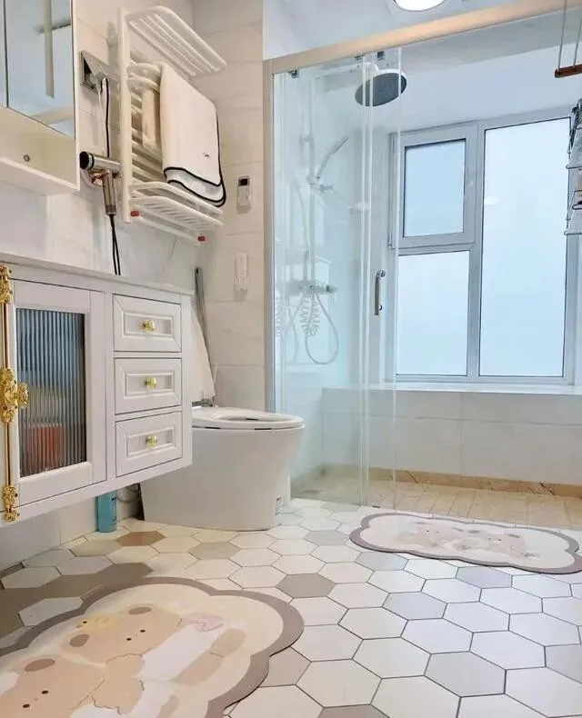 地面铺的六边形瓷砖 , 好看又防滑 , 墙面是白色砖 , 整个空间亮堂堂的 , 清爽干净。