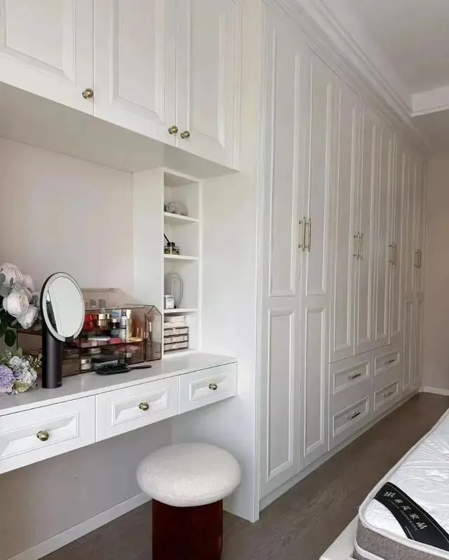 衣柜做了一整排 , 从头到尾全是柜子 , 里面分区做好了 , 挂杆、隔板、抽屉都有 , 衣服再多也塞得下。