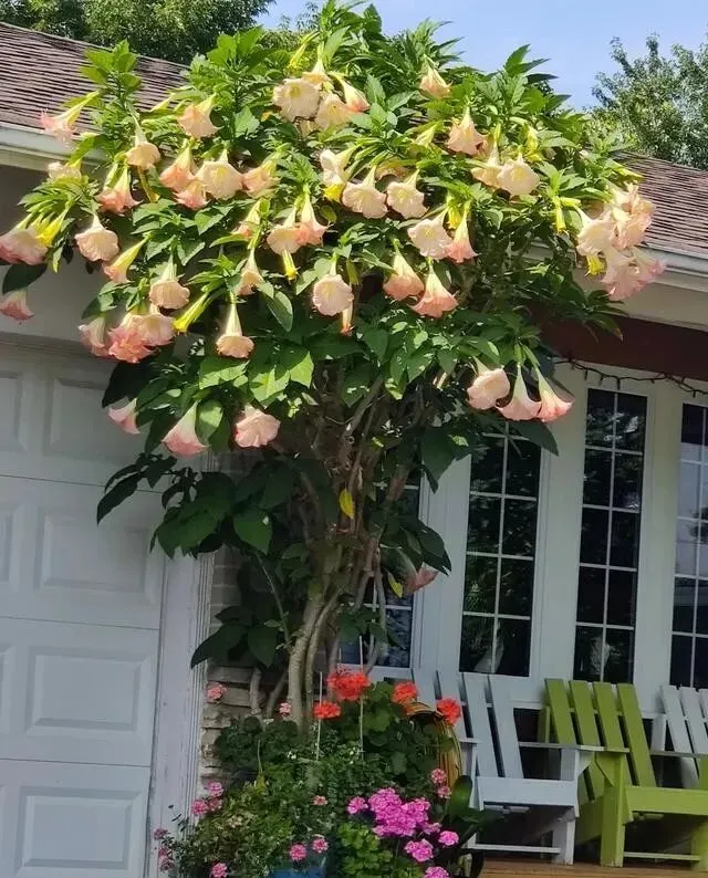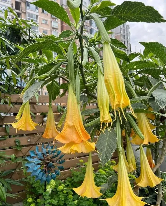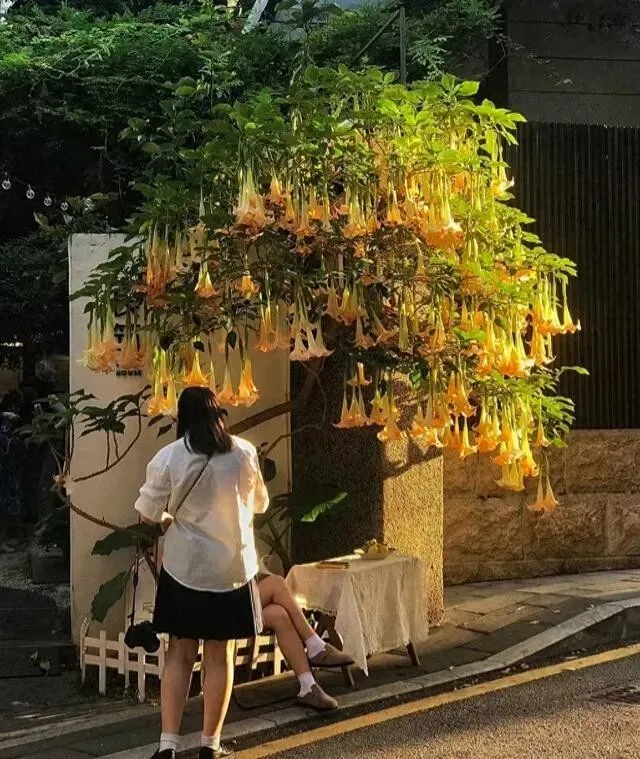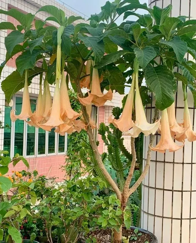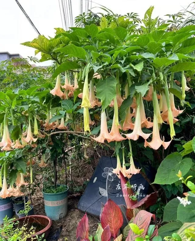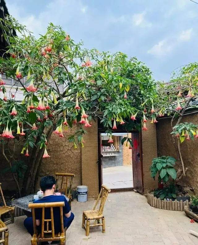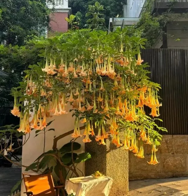 广州有户人家 , 门口种了棵曼陀罗 , 去年开花的时候 , 天天有人来打卡拍照。