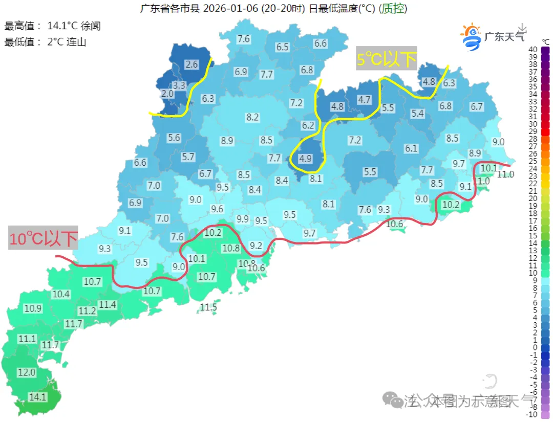 据“广东天气”消息,弱冷空气补充影响广东,昨天(1月5日)到今天(1月6日)早晨广东全省气温出现了小幅下降,今晨最低气温:粤北、珠三角北部市县2℃—6℃,其中高海拔山区零下1℃—2℃,粤西和珠江口沿海市县11℃—14℃,其余市县普遍介于7℃—10℃,其中清远连山录得全省最低气温2.0℃。
