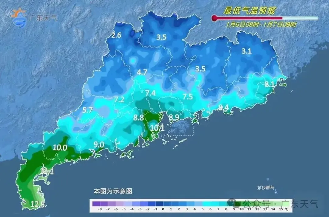 预计未来几天,中高纬度的低槽快速东移为主,引导低层弱冷空气南下补充影响广东,1月7日—8日广东上空为偏北气流控制,湿度减小,有利于昼夜温差加大,整体维持天晴干燥、早晚寒冷的天气,早晨气温较低,粤北、珠三角北部市县仍有5℃以下低温,其中高海拔山区零下4℃—0℃,有霜冻和冰冻,防寒保暖别放松。