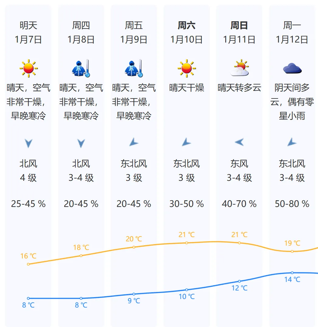 1月7日—8日晴天干燥,昼夜温差大,早晚寒冷,其中7日气温8℃—16℃。