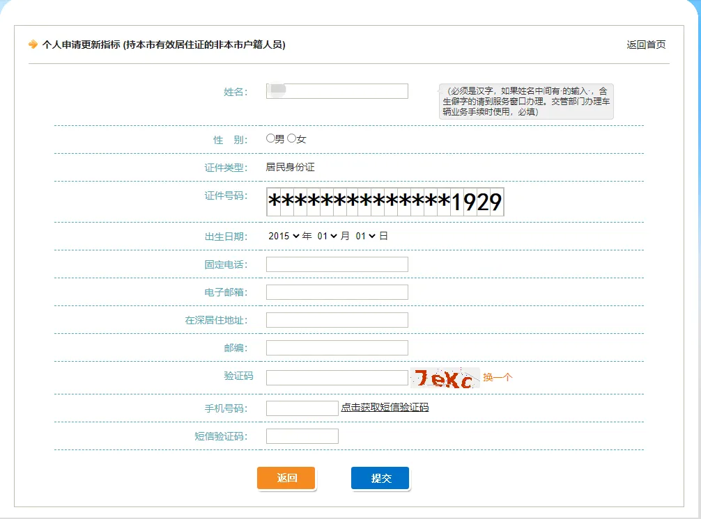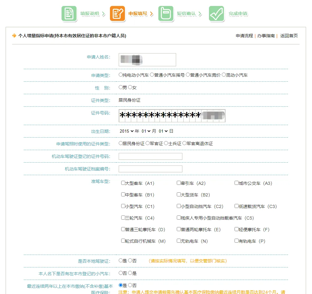 第五步,进入个人申请更新指标-申请页面,录入车辆相关信息。