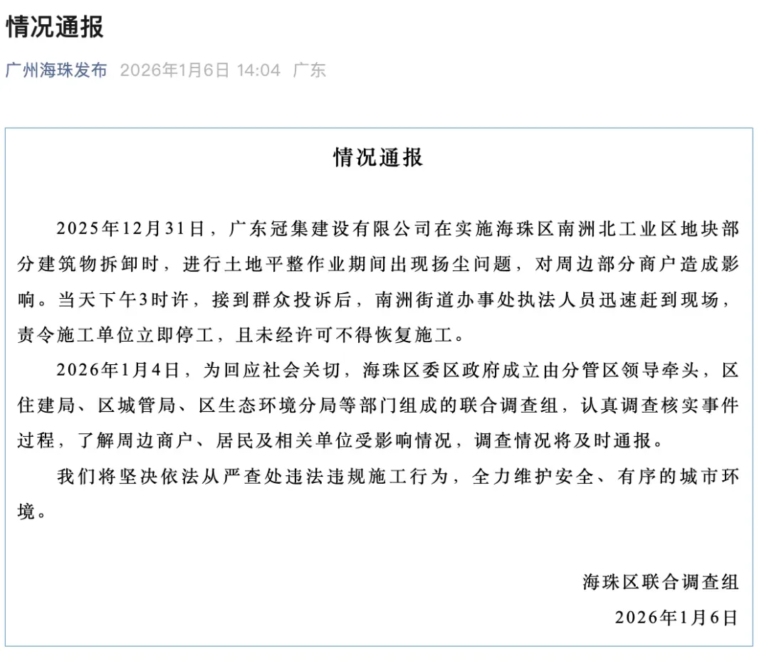 2026年1月4日,为回应社会关切,海珠区委区政府成立由分管区领导牵头,区住建局、区城管局、区生态环境分局等部门组成的联合调查组,认真调查核实事件过程,了解周边商户、居民及相关单位受影响情况,调查情况将及时通报。