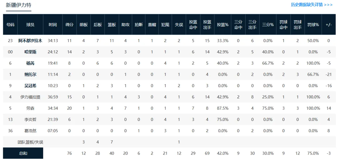 数据统计:劳森20分4篮板7助攻,伊力福拉提15分4助攻3抢断,哈里斯14分5篮板3助攻,沙拉木11分11篮板4助攻,杨芮8分6篮板,李炎哲6分3篮板,纳托尔2分,吴冠希3篮板。