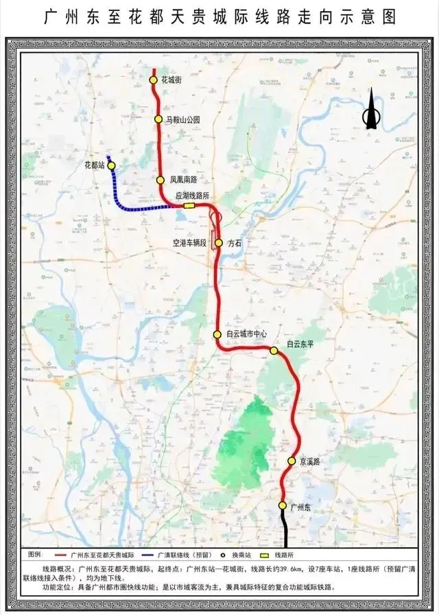 广花城际线路起于18号线已运营的广州东站,向北途径京溪路、白云东平、白云城市中心,连接方石、凤凰南路、马鞍山公园,止于花都花城街站,新建7座车站,线路长39.6公里,设计速度160公里/小时。