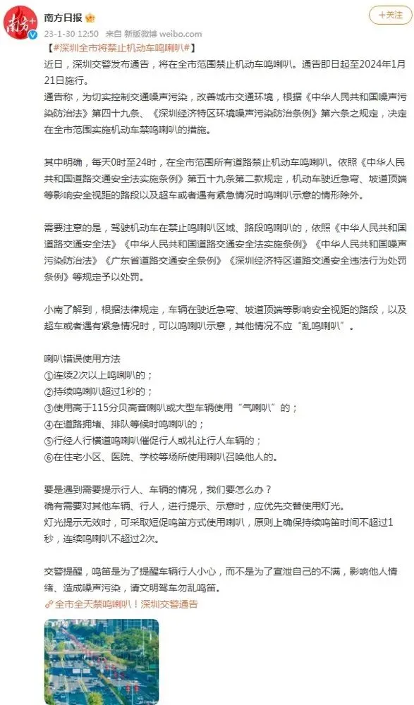 近日,深圳交警发布通告,将在全市范围禁止机动车鸣喇叭。通告即日起至2024年1月21日施行。