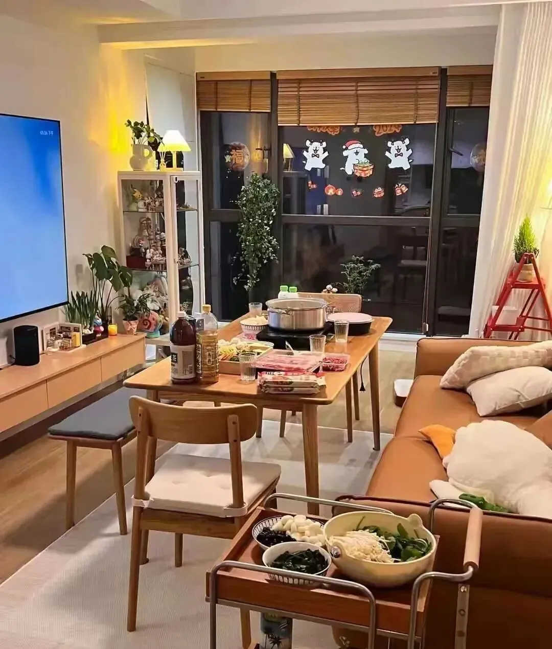 人多的时候把餐桌推到沙发前 , 大家一起窝着吃饭看电视。