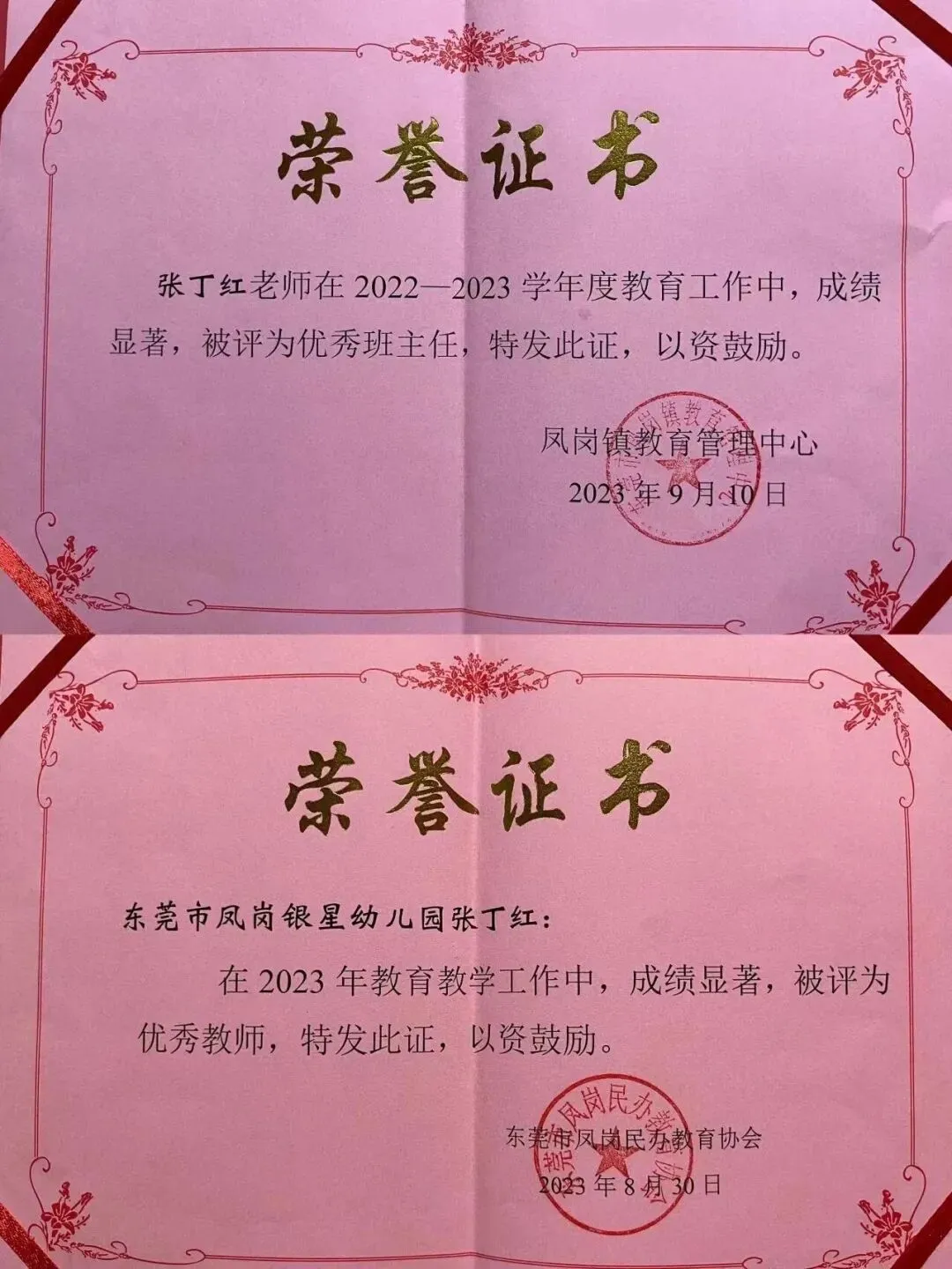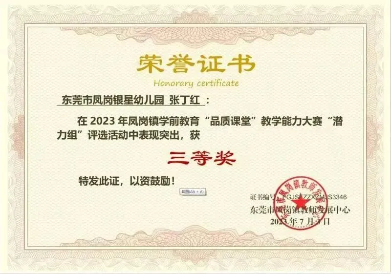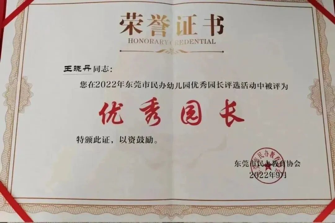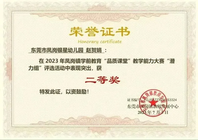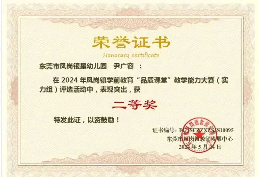 一滴滴汗水伴随着成长,近几年东莞市凤岗银星幼儿园相继荣获:莞香花开大赛“优秀组织奖”;王晓丹园长荣获东莞市民办协会优秀园长;张丁红教师荣获凤岗镇优秀教师、民办协会优秀班主任。赵贺娟、张丁红、尹广容老师分别先后荣获凤岗镇“品质课堂”二等奖及三等奖。教职工团队团结一心、开拓创新、凝心聚力,为提升保育教育质量共同努力,让每一位孩子成为最好的自己。