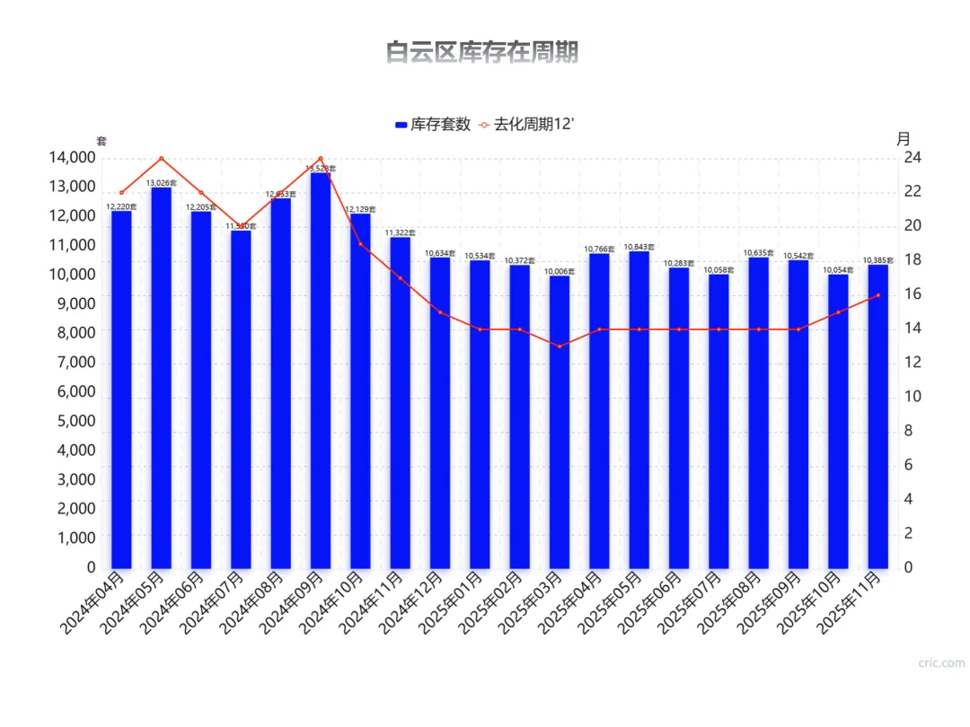 虽然广州的整体库存仍然在高位盘旋,但是分区域和板块来看,白云区已经从24年9月高位的24个月,降到了现在的16个月。