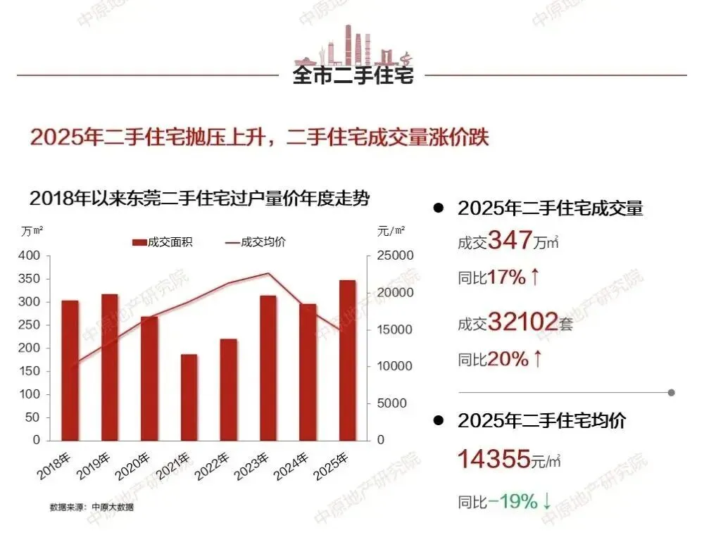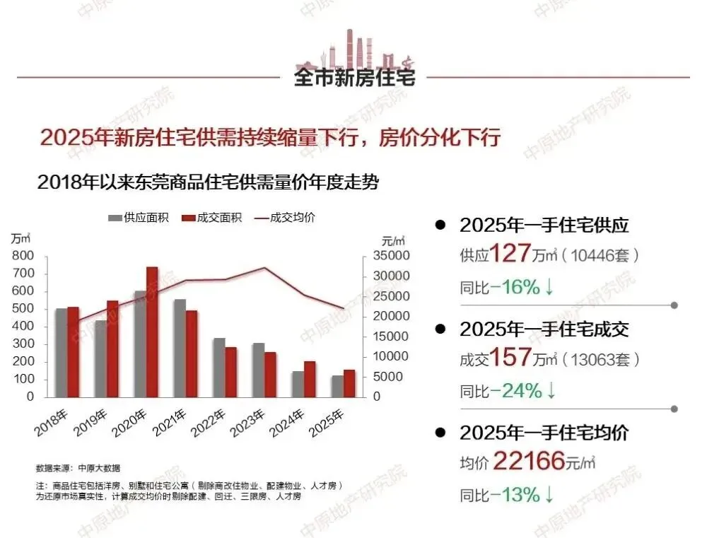 2025年东莞新房网签均价为22166元/㎡,二手房网签均价为14355元/㎡,均未能突破3字头,同比分别-13%、-19%。