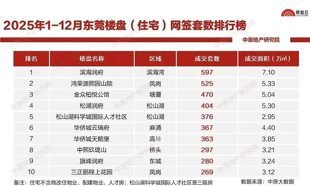 根据中原地产研究院数据显示,2025年东莞卖得最好的住宅项目前十名分别是:滨海润府(597套)、鸿荣源熙园山院(525套)、金众柏悦公馆(470套)、松湖润府(404套)、松山湖科学城国际人才社区(376套)、华侨城云瑞府(367套)、华侨城天鹅堡(363套)、中熙玖珑山(297套)、旗峰润府(280套)、三正鹏程上花园(269套)。