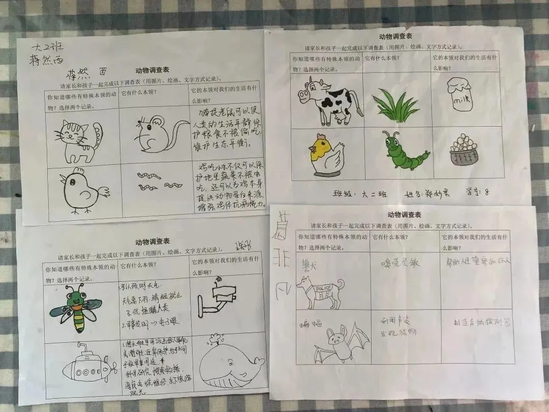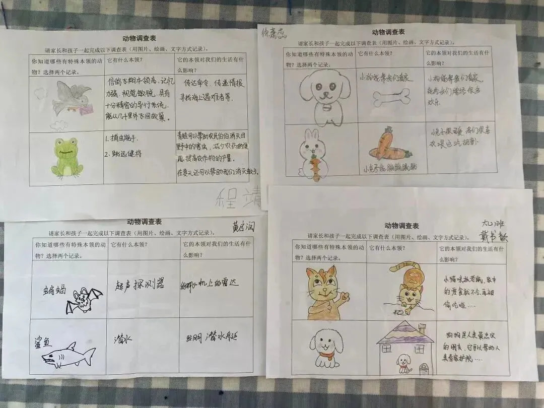 在主题活动开展前,我们通过“动物调查表”支架来支持小朋友的探究,鼓励孩子们邀请爸爸妈妈参与到调查中,通过写一写、画一画的形式记录下来,和小伙伴们一同分享,共同去发现小动物的秘密。