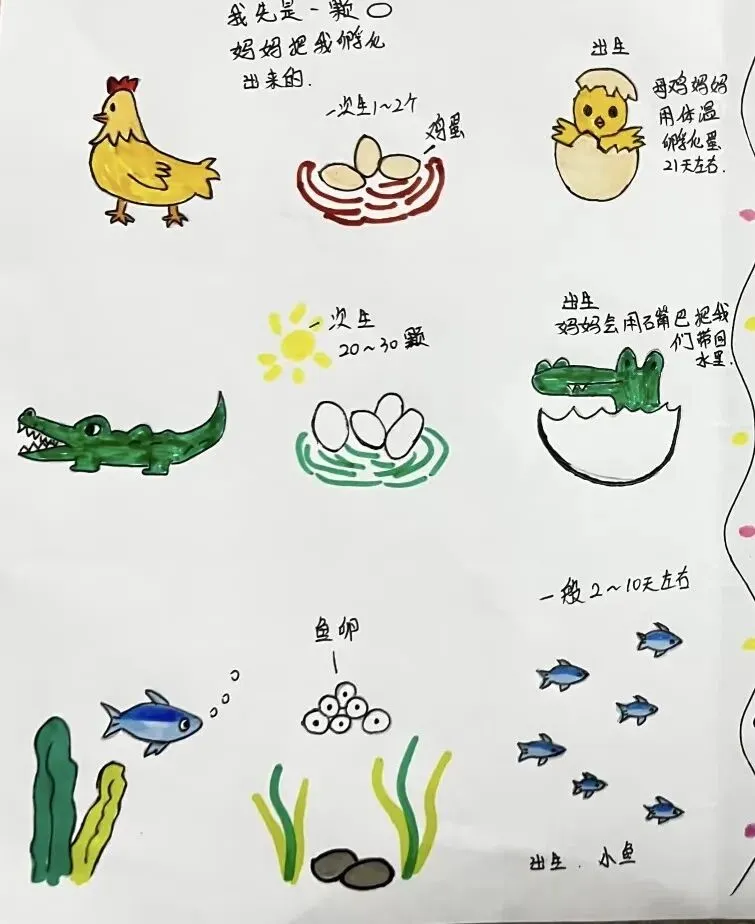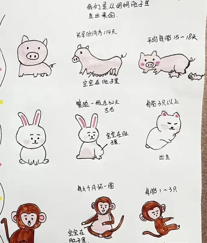 在动物世界里孩子们发现了动物的出生方式是不一样的,通过查阅资料,观看绘本、视频等方式,孩子们了解了动物有两种不同的出生方式:胎生和卵生。