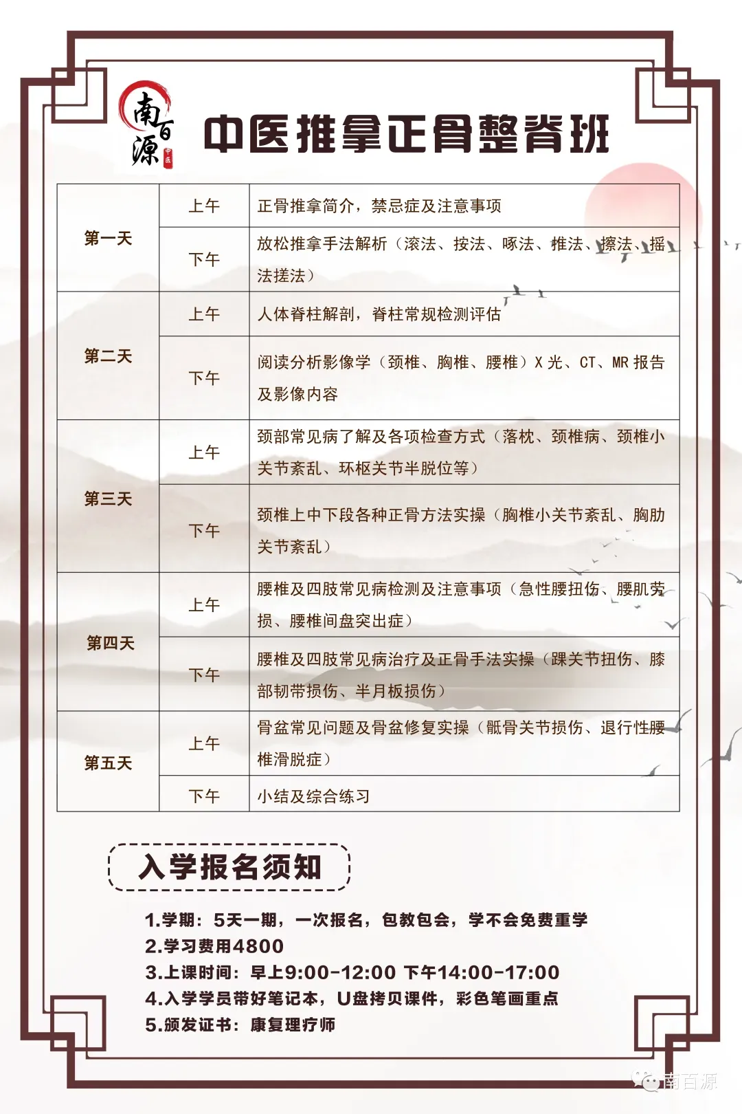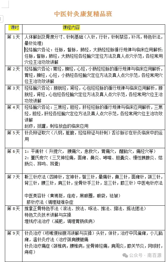 - 学期:9天时间为一个周期,循环开班,循环学习,(小班包教会+免费复训+推荐医院实习)