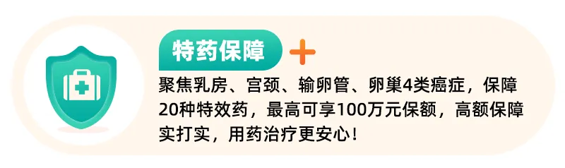 专注女性乳房、宫颈、输卵管、卵巢4类癌症,涵盖20种特效药,最高保障100万元,等待期30天,用药报销更贴心。(经医保结算后,剩余费用100%报销;未经医保结算,按60%比例报销。)